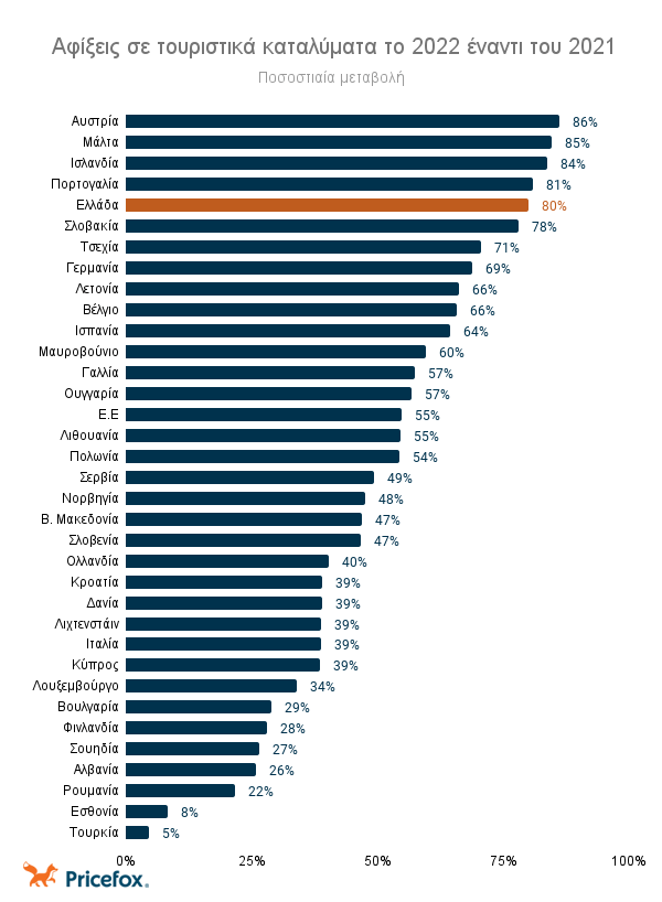Στη νέα του έρευνα σχετικά με τον τουρισμό το 2022 στην Ελλάδα και την Ευρώπη, το Pricefox παρουσιάζει στοιχεία που αποκαλύπτουν την ανάκαμψη του τουρισμού. Συγκεκριμένα, η Ελλάδα ήταν από τις χώρες που κατέγραψαν την μεγαλύτερη ανάκαμψη, ξεπερνώντας τα επίπεδα της Ε.Ε. στο σύνολό της. Τον Αύγουστο του 2022 κατέγραψε τη μεγαλύτερη πληρότητα ξενοδοχείων και καταλυμάτων της τελευταίας 14ετίας.