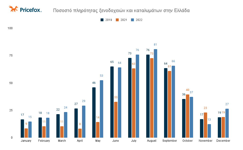 Οι μήνες του Ιουλίου, Αυγούστου και Σεπτεμβρίου το 2022 ήταν οριακά χαμηλότεροι σε πληρότητα από τους ίδιους μήνες το 2019 μαρτυρώντας μία τάση επιστροφής στα κανονικά επίπεδα. Για τους τελευταίους μήνες του 2022 δεν υπάρχουν δεδομένα για την πληρότητα των καταλυμάτων στην Ε.Ε.