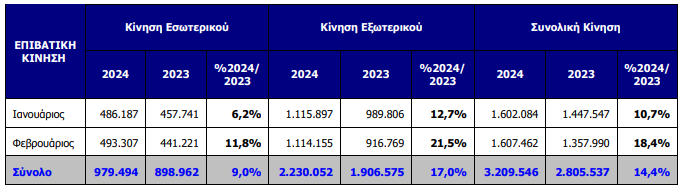 Η επιβατική κίνηση του αεροδρομίου της Αθήνας κατά τη διάρκεια του Φεβρουαρίου 2024 ανήλθε σε 1,6 εκατ., αυξημένη κατά 18,4% σε σύγκριση τα επίπεδα του Φεβρουαρίου 2023. Αναλυτικά, τόσο η εγχώρια όσο και η διεθνής επιβατική κίνηση ξεπέρασαν τα επίπεδα του 2023 κατά 11,8% και 21,5% αντίστοιχα.