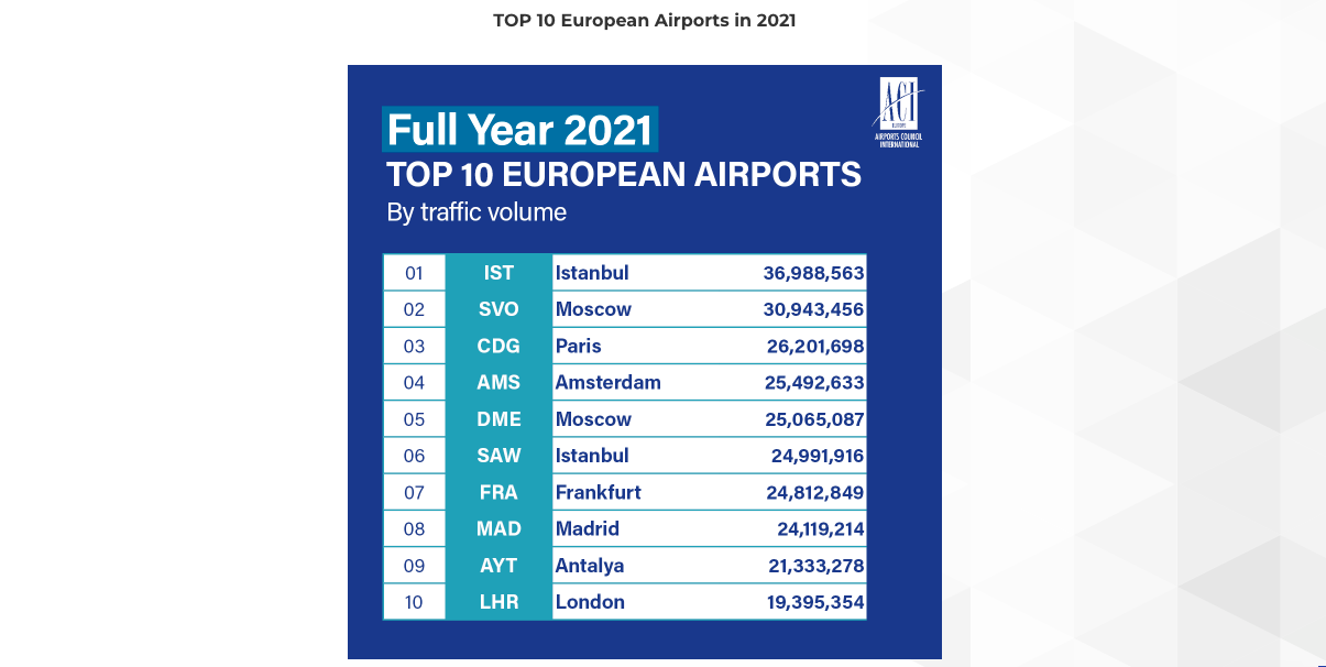 Aπό πλευράς αριθμού επιβατών, στο τοπ 5 των πιο πολυσύχναστων αεροδρομίων ήταν αυτό της Κωνσταντινούπολης, με πτώση κατά 46% έναντι του 2019, στη δεύτερη θέση το διεθνές αεροδρόμιο Σερεμέτιεβου της Μόσχας (-38%), τρίτο το διεθνές αεροδρόμιο Σαρλ ντε Γκωλ στο Παρίσι (-65,6%).