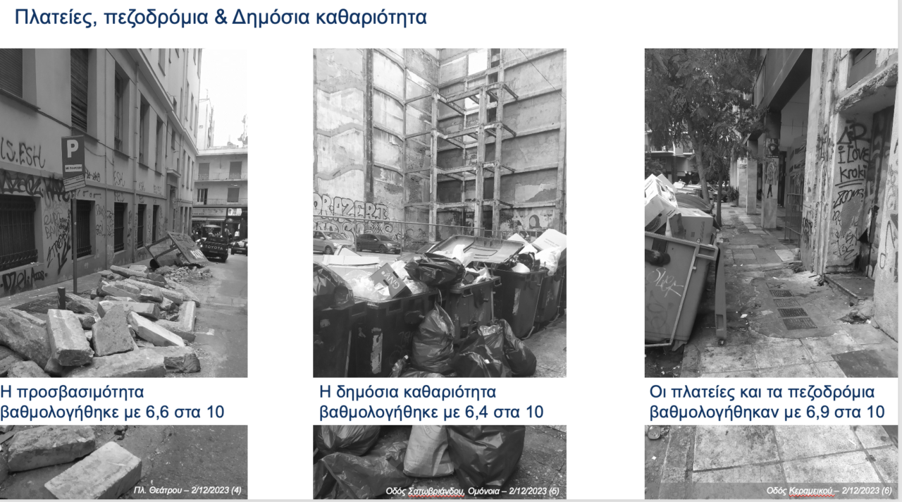 Κι αν οι επισκέπτες δηλώνουν ικανοποιημένοι από τις ξενοδοχειακές εγκαταστάσεις με βαθμό 8,8 και 8,4 στα 10 όσον αφορά τη σχέση ποιότητας / τιμής, οι βαθμολογίες που συγκεντρώνουν τα θέματα που σχετίζονται με την εικόνα στα πεζοδρόμια και τις πλατείες, την καθαριότητα και την ασφάλεια έχουν βελτιωθεί μεν κατά τι σε σχέση με τις προηγούμενες, αντίστοιχες έρευνες, παραμένουν ωστόσο οι πιο χαμηλές σε σύγκριση με άλλα σημεία που εξετάζει η έρευνα για την πρωτεύουσα. Σύμφωνα μάλιστα με τον κ. Stefan Merkenhof επικεφαλής συμβουλευτικών υπηρεσιών της GBR Consulting «τα πράγματα είναι πιο δύσκολα για την περιοχή κάτω από την Ομόνοια, παρά τη σαφή βελτίωση της πλατείας και την προσθήκη νέων αναπτύξεων όπως είναι αυτή για το πρώην ΜΙΝΙΟΝ».