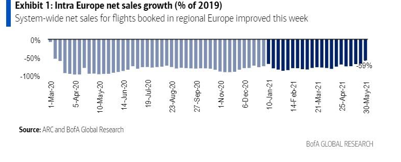 Οι ημερήσιες επισκέψεις στους ιστότοπους για τις αεροπορικές εταιρείες της ΕΕ συνέχισαν να αυξάνονται κατά 2% στο επίπεδο του -43% του 2019 για την εβδομάδα που έληξε στις 2 Ιουνίου από -45% την προηγούμενη εβδομάδα, υπολογίζει η BofA. H Lufthansa παρουσίασε τη μεγαλύτερη βελτίωση κατά 15%, πιθανώς σχετιζόμενη με την πρόωρη έγκριση του ψηφιακού πιστοποιητικού COVID-19 της ΕΕ από τη Γερμανία. Στις περισσότερες άλλες αεροπορικές εταιρείες σημειώθηκε βελτίωση κατά τουλάχιστον 3%.