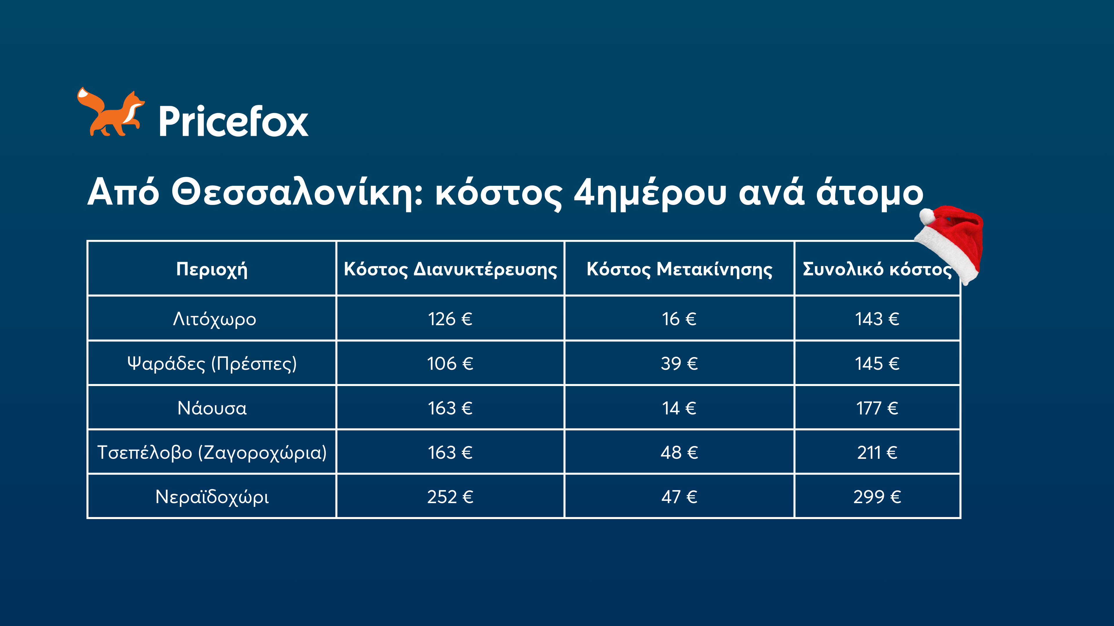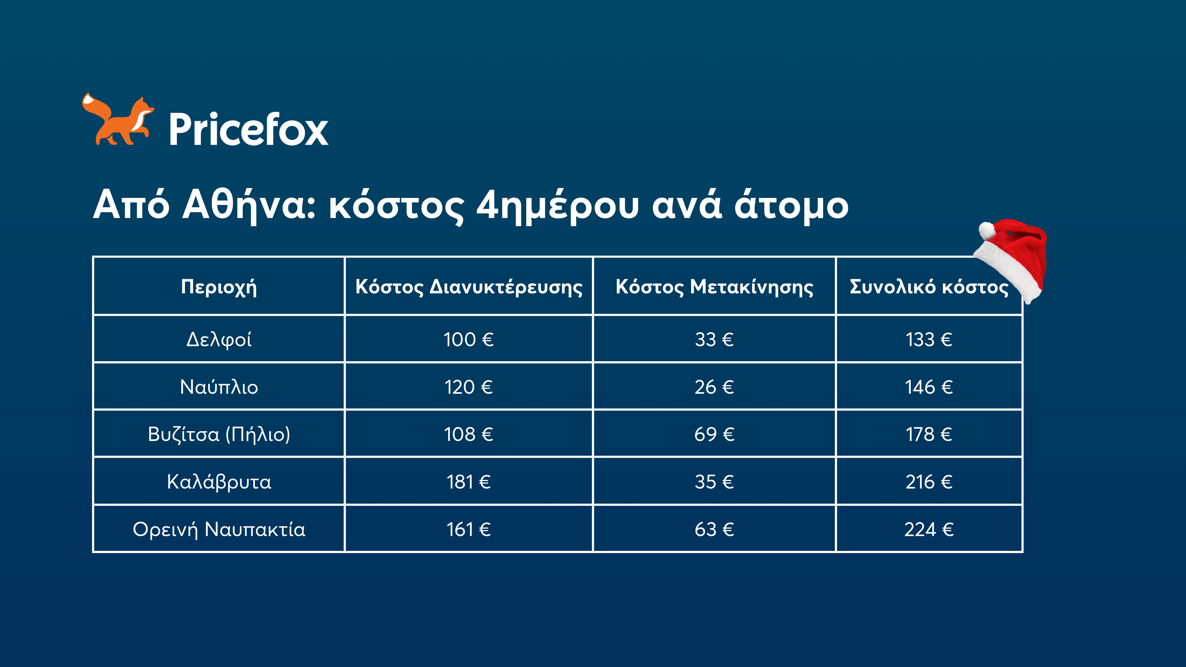 *Οι τιμές είναι υπολογισμένες για δύο άτομα για την περίοδο 22-26 Δεκεμβρίου, με ένα δικό τους αυτοκίνητο μέσω του Booking και του Βρίσκω Απόσταση.