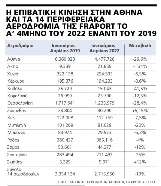 Για τα ελληνικά αεροδρόμια οι πρόδρομοι δείκτες είναι ήδη καλύτεροι του αναμενομένου: στο «Ελευθέριος Βενιζέλος» πλέον η επιβατική κίνηση είναι κοντά στο -15% στο δίμηνο Απριλίου – Μαΐου, ενώ για την περίοδο του τετραμήνου Ιανουαρίου – Απριλίου 2022 στο -29,6% σε σύγκριση με το 2019, λίγο κάτω από τα 4,5 εκατομμύρια επιβάτες.