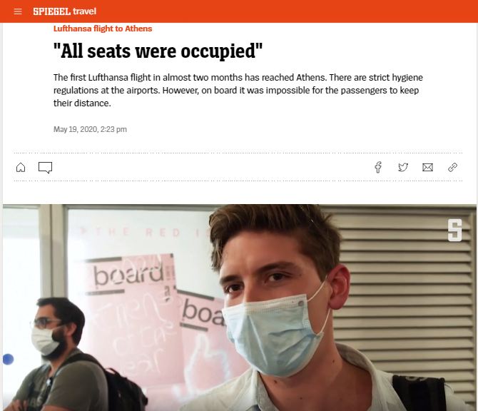Βίντεο με την άφιξη επιβατών στο αεροδρόμιο Ελευθέριος Βενιζέλος δημοσιεύει στην ιστοσελίδα του τo γερμανικό Spiegel και γράφει: «Η πρώτη πτήση της Lufthansa εδώ και δυο μήνες έφθασε στην Αθήνα. Στα αεροδρόμια ισχύουν πολύ αυστηροί κανόνες υγιεινής ωστόσο στην καμπίνα του αεροπλάνου ήταν αδύνατον για τους ταξιδιώτες να κρατήσουν αποστάσεις».