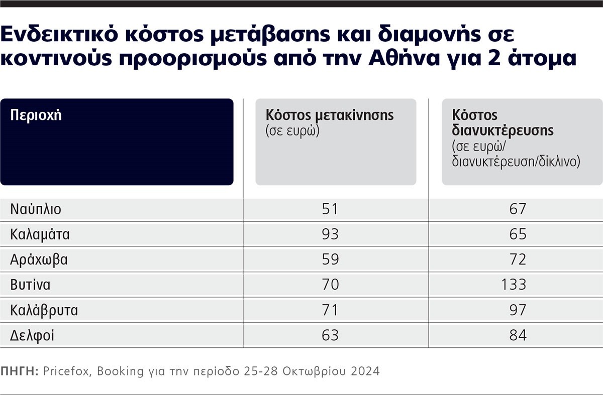 Ενδεικτικά, για τη μετάβαση από την Αθήνα, με βάση τα στοιχεία που συνέλεξε η πλατφόρμα Pricefox (www.pricefox.gr) για τους πιο κοντινούς προορισμούς, το Ναύπλιο είναι η πλέον οικονομική επιλογή ως προς το κόστος μετακίνησης που υπολογίζεται στα 51 ευρώ, ενώ το κόστος διανυκτέρευσης ανά ημέρα για ένα δίκλινο είναι κάτω των 70 ευρώ.