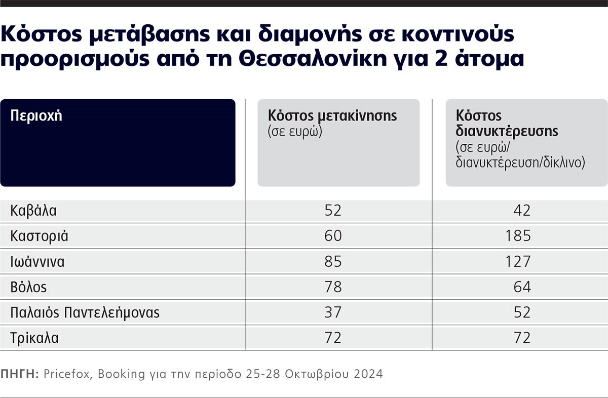 Οι Δελφοί έχουν κόστος μετακίνησης στα 63 ευρώ και διανυκτέρευσης στα 84 ευρώ, ενώ στα Καλάβρυτα η μετακίνηση κοστίζει 71 ευρώ και η διανυκτέρευση 97 ευρώ. Σημειωτέον ότι οι τιμές για τη βενζίνη και τα διόδια μετ’ επιστροφής έχουν υπολογιστεί με τη βοήθεια του www.vriskoapostasi.gr, ενώ για τη διαμονή ελήφθησαν υπόψη στοιχεία από την πλατφόρμα της Booking.com για την περίοδο από τις 25 έως τις 28 Οκτωβρίου με κριτήρια τα καταλύματα με τις μεγαλύτερες αξιολογήσεις και την καλύτερη (όχι φθηνότερη) τιμή, εξ ου και οι περιοχές με μικρότερη προσφορά καταλυμάτων μπορεί να είναι πιο ακριβές του αναμενομένου. Από τη Θεσσαλονίκη η πιο οικονομική επιλογή είναι η Καβάλα με κόστος μετακίνησης στα 52 ευρώ και διανυκτέρευση ανά ημέρα στα 42 ευρώ, ενώ σαφώς πιο ακριβή επιλογή είναι η Καστοριά, όπου ναι μεν η δαπάνη για μετακίνηση υπολογίζεται στα 60 ευρώ, ωστόσο η διανυκτέρευση ανεβαίνει στα 185 ευρώ ανά ημέρα, δεδομένης και της μικρότερης προσφοράς καταλυμάτων.