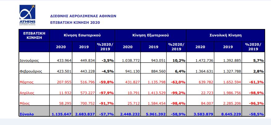 Οι επιβάτες, τόσο των πτήσεων εσωτερικού όσο και των διεθνών πτήσεων, κατέγραψαν μείωση της τάξης του 91,7% και 98,4% αντίστοιχα: Ενδεικτικό αποτελεί το γεγονός ότι από το 1,58 εκατ. επιβάτες του Μαϊου του 2019, ο αντίστοιχος αριθμός φέτος ήταν λίγο πάνω από τις 25.700 όσον αφορά την κίνηση εξωτερικού (κυρίως επαναπατρισμούς), ενώ στην κίνηση εσωτερικού από τις 701 χιλ. σχεδόν του περυσινού Μαϊου φέτος το νούμερο μόλις ξεπέρασε τις 58 χιλιάδες.