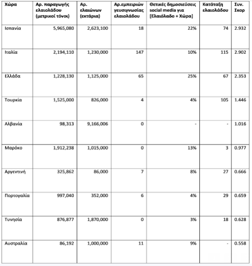 Η Ελλάδα καταλαμβάνει την τρίτη θέση στον κατάλογο με τις περισσότερες θετικές αναρτήσεις στο διαδίκτυο γύρω από το ελαιόλαδό της και τις δεύτερες περισσότερες εμπειρίες γευσιγνωσίας ελαιολάδου. Η Ελλάδα μπορεί να υπερηφανεύεται για την ακόμη μεγαλύτερη ιστορία της ελαιοκαλλιέργειας σε σχέση με την Ιταλία, η οποία χρονολογείται ήδη από το 3500 π.Χ.