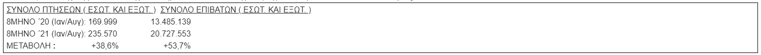 Παράλληλα τα συνολικά στατιστικά στοιχεία οκταμήνου 2021, από όλα τα αεροδρόμια της χώρας μας, για δεύτερο συνεχόμενο μήνα, μετά την πανδημία της νόσου Covid-19 καταγράφουν άνοδο (+) 53,7% σε σχέση με την αντίστοιχη περσινή σεζόν, ενώ σε σχέση με το αντίστοιχο οκτάμηνο Ιανουαρίου/Αυγούστου του 2019 όπου δεν είχαν τεθεί σε ισχύ απαγορεύσεις και περιορισμοί πτήσεων λόγω της πανδημίας η πτώση φτάνει το (-) 53,8%.