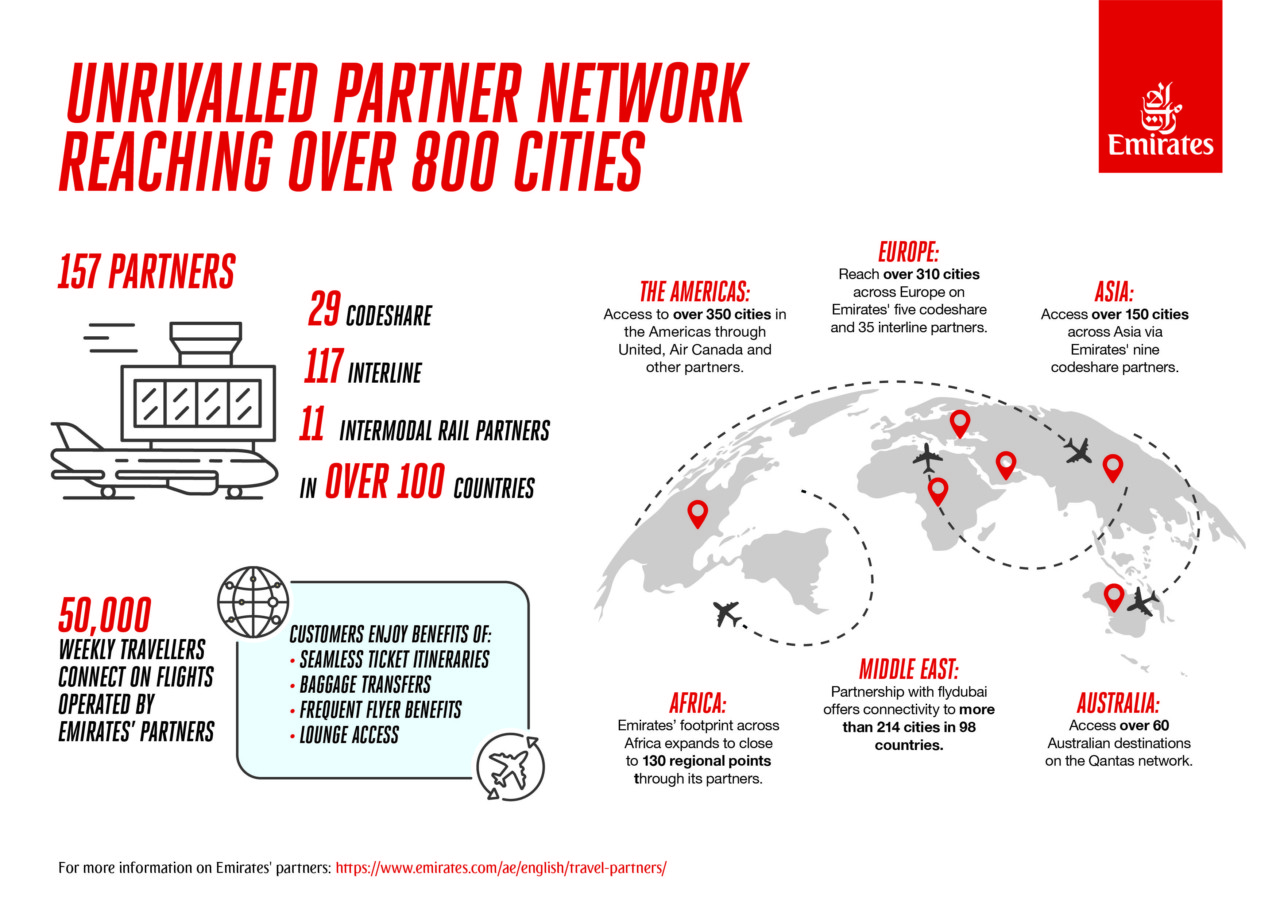Οι στρατηγικές συνεργασίες με περισσότερες από 140 αεροπορικές εταιρείες ενίσχυσαν τη συνδεσιμότητα των επιβατών της Emirates, αυξάνοντας τους προορισμούς στους οποίους μπορούν να ταξιδέψουν με ένα ενιαίο εισιτήριο, παρέχοντάς τους παράλληλα τη δυνατότητα να επωφεληθούν από τα προνόμια του προγράμματος επιβράβευσης.