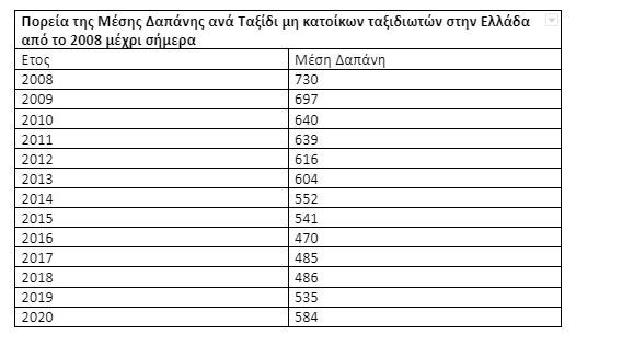 Σύμφωνα με τη σχετική ανάλυση από το Ινστιτούτο του Συνδέσμου Ελληνικών Τουριστικών Επιχειρήσεων για τη Μέση κατά Κεφαλή Δαπάνη των εισερχόμενων τουριστών στη χώρα μας την περίοδο 2010- 2019, η διαρκής μείωση της Μέσης κατά Κεφαλήν Δαπάνης (ΜΚΔ) των εισερχόμενων τουριστών έχει αποδοθεί κατά καιρούς σε διάφορα αίτια που εκτείνονται από την παγκόσμια τάση μείωσης της Μέσης Διάρκειας Παραμονής των τουριστών έως την «υποβάθμιση» του ελληνικού τουριστικού προϊόντος. «Η μείωση της Μέσης κατά Κεφαλήν Δαπάνης (ΜΚΔ) κατά -76,4 ευρώ /-11,9% την δεκαετία 2010- 2019 στην Ελλάδα συνέβη παρά την αύξηση της Μέσης Δαπάνης ανά Διανυκτέρευση (ΜΔΔ) κατά 7,5 ευρώ / + 10,6%. Είναι αξιοσημείωτο ότι η αύξηση αυτή επιτεύχθηκε παρά την αλλαγή του μίγματος αγορών του εισερχόμενου τουρισμού με αύξηση του μεριδίου των χωρών με χαμηλότερα εισοδήματα και παρά τον υπερδιπλασιασμό του αριθμού των εισερχόμενων τουριστών (από 15εκατ. το 2010 σε 31,3 εκατ. το 2019)».