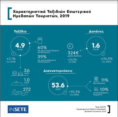 -Το 2019 πραγματοποιήθηκαν 4,9 εκατ. προσωπικά ταξίδια εσωτερικού, σημειώνοντας μείωση κατά 11%/-582 χιλ. σε σχέση με το 2018, 53,6 εκατ. διανυκτερεύσεις παρουσιάζοντας μείωση κατά 6 εκατ./-10% και δαπανήθηκαν σε ταξίδια που πραγματοποιήθηκαν στο εσωτερικό 1,6 δισ. ευρώ, καταγράφοντας μείωση κατά 6,8%.