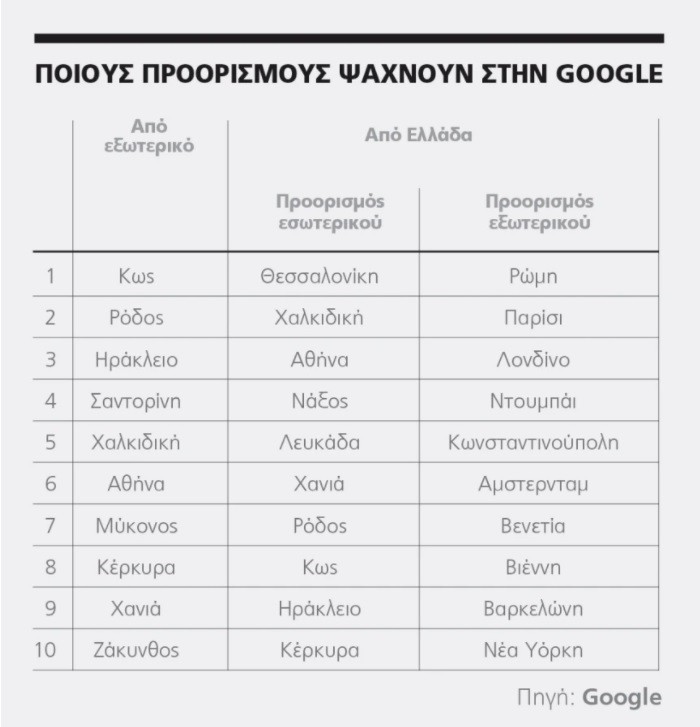 Μια ενδιαφέρουσα εικόνα για τις προτιμήσεις των ταξιδιωτών όσον αφορά στις κρατήσεις της τελευταίας στιγμής δίνουν τα στοιχεία από την Google σε σχέση με τις αναζητήσεις από το διεθνές κοινό που πραγματοποιήθηκαν μέσα στον Ιούλιο για ταξίδια στη χώρα μας. Από την 1η έως τις 23 Ιουλίου και ως προς τις αναζητήσεις από το εξωτερικό για διαμονή σε ελληνικούς προορισμούς, στην κορυφή παραμένουν (όπως και το προηγούμενο διάστημα) σταθερά η Κως, η Ρόδος και το Ηράκλειο, ενώ ακολουθούν Σαντορίνη, Χαλκιδική, Αθήνα, Μύκονος, Κέρκυρα, Χανιά και Ζάκυνθος που συμπληρώνουν τη δεκάδα.