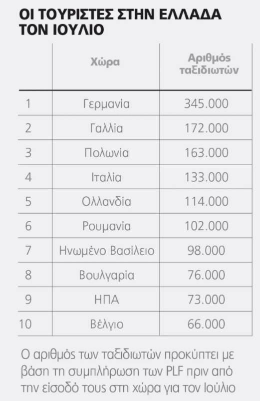 Τον φετινό Ιούλιο οι αφίξεις με όλα τα μέσα από την (πρώτη) Γερμανία είναι στις 345.000, ακολουθεί η Γαλλία με 172.000, η Πολωνία με 163.000 και εν συνεχεία Ιταλία, Ολλανδία και Ρουμανία με νούμερα -και οι τρεις- πάνω από τις 100.000. Τα συμπληρωμένα PLF από το Ηνωμένο Βασίλειο, τη δεύτερη αγορά για τη χώρα μας που άνοιξε φέτος στο τελευταίο δεκαήμερο του Ιουλίου λόγω του μέτρου της καραντίνας με την επιστροφή στη χώρα, είναι στους 98.000 ταξιδιώτες – και εδώ είναι ένα μεγάλο στοίχημα για τη συνέχεια, δεδομένου ότι οι προσδοκίες από τη βρετανική αγορά είναι ότι θα κινούνταν καλύτερα από τις αρχές Αυγούστου και μετά. Η αγορά των ΗΠΑ -από τις πλέον σημαντικές λόγω δαπάνης- βρίσκεται στην 9η θέση της συνολικής κατάταξης των αγορών με τις περισσότερες αφίξεις για τη χώρα μας, ενώ πολύ περιορισμένος είναι ο αριθμός των αφίξεων από τη Ρωσία, μόλις στις 25.000, λόγω του μειωμένου αριθμού των πτήσεων σε αυτή τη φάση από τη ρωσική αγορά.