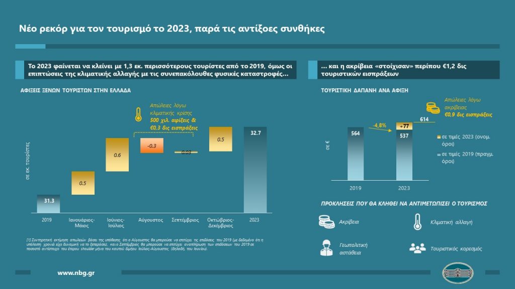 Υπό αυτό το πρίσμα, ο ελληνικός τουρισμός αναμένεται να καταγράψει φέτος νέο ρεκόρ αφίξεων (+4% έναντι 2019), με τις εισπράξεις να ξεπερνούν το επίπεδο των €20 δισ. – επίπεδο συμβατό με την προηγούμενη εκτίμησή μας (τεύχος τρίτου τριμήνου) – καταλήγοντας έτσι 13% υψηλότερα σε σχέση με το 2019. Αξιοσημείωτο είναι ότι η εξαιρετική αυτή επίδοση επιτυγχάνεται σε μια χρονιά με αντίξοες συνθήκες, οι οποίες στοίχισαν στον ελληνικό τουρισμό εισπράξεις της τάξης του €1,2 δισ., αφού: