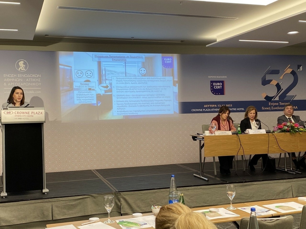 Η EUROCERT συμμετείχε στη Συνεδρίαση, στο πλαίσιο της 52ης Ετήσιας Τακτικής Γενικής Συνέλευσης της Ένωσης Ξενοδόχων Αθηνών-Αττικής και Αργοσαρωνικού, η οποία πραγματοποιήθηκε πρόσφατα στην Αθήνα.