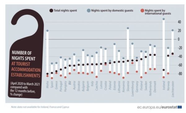 Μεταξύ Απριλίου 2020 και Μαρτίου 2021 σε σύγκριση με το αντίστοιχο προηγούμενο δωδεκάμηνο, οι διανυκτερεύσεις που πραγματοποίησαν μη κάτοικοι της χώρας (διεθνείς επισκέπτες) μειώθηκαν 79% κατά μέσο όρο στην ΕΕ, ενώ οι διανυκτερεύσεις από κατοίκους (οικιακοί επισκέπτες) μειώθηκαν κατά 45%.