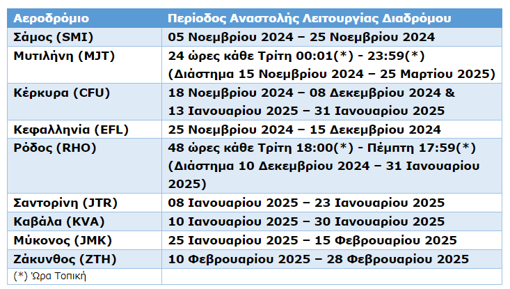 Υπενθυμίζεται, ότι κατά τη διάρκεια των ανωτέρω περιόδων θα πραγματοποιούνται από ελικόπτερα, πτήσεις επείγοντος χαρακτήρα (αεροδιακομιδές, πτήσεις έρευνας και διάσωσης, πυρόσβεσης, ανθρωπιστικές, κρατικές και λοιπές πτήσεις εθνικού χαρακτήρα), εφόσον απαιτηθεί, ενώ όλες οι υπηρεσίες των αεροδρομίων, θα λειτουργούν κανονικά, για το ενδιαφερόμενο κοινό.