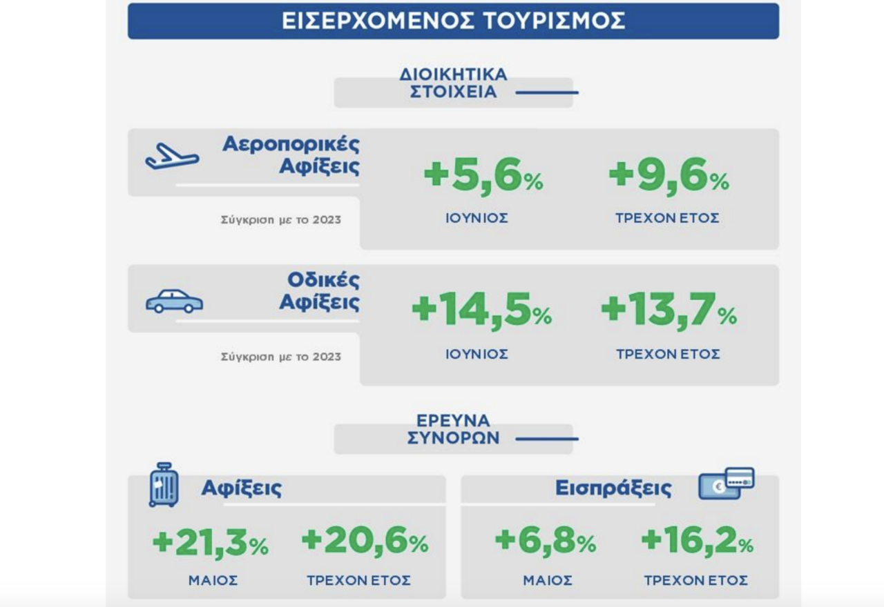 Σημειωτέον ότι ο κλάδος, συνεχίζει και φέτος σε ανοδική τροχιά στις τουριστικές αγορές της Μεσογείου, με τα επίσημα στοιχεία ειδικά για την Ελλάδα να παραπέμπουν σε άνοδο διεθνών αφίξεων σε ποσοστό 10,7%. Με βάση τα στοιχεία από το ΙΝΣΕΤΕ για το πρώτο εξάμηνο του 2024, οι διεθνείς αεροπορικές και οδικές αφίξεις ανήλθαν σε 13,76 εκατομμύρια και από αυτές τα 9,745 εκατ. αφορούν τις διεθνείς αφίξεις από αέρος και τα 4 εκατ. τις οδικές. Αντίστοιχα για την περίοδο Ιανουαρίου- Ιουνίου 2023 το σύνολο των διεθνών αεροπορικών και οδικών αφίξεων είχε ξεπεράσει 12,4 εκατ., εκ των οποίων τα 8,89 εκατ. ήταν οι διεθνείς αεροπορικές και τα 3,5 εκατ. οι οδικές. Αύξηση, με βάση τα επίσημα στοιχεία της Τράπεζας της Ελλάδος έχουν σημειώσει την περίοδο Ιανουαρίου-Μαΐου 2024, και οι ταξιδιωτικές εισπράξεις κατά 16,2%, σε σύγκριση με την αντίστοιχη περίοδο του 2023 φτάνοντας τα 3,8 δις. ευρώ.