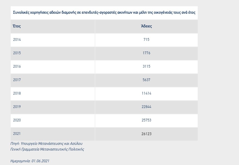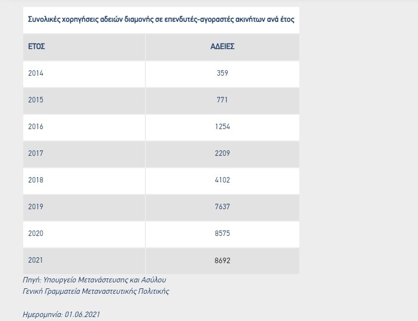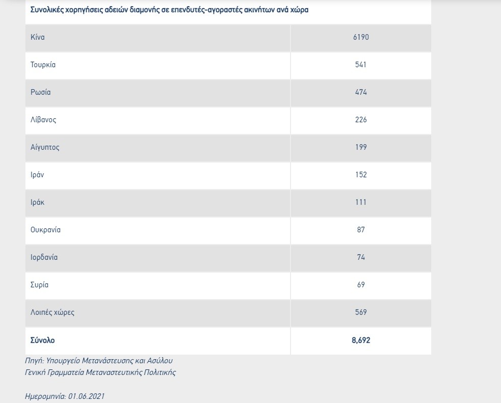 Αναλυτικά ως προς τις συνολικές χορηγήσεις αδειών διαμονής σε επενδυτές- αγοραστές ακινήτων ανά χώρα, από την αρχή του προγράμματος το 2014 έως τις αρχές Ιουνίου 2021 έχουν δοθεί συνολικά 8.692 άδειες διαμονής, εκ των οποίων οι 6.190 σε Κινέζους και ακολουθούν οι Τούρκοι με 541 και οι Ρώσοι με 474.