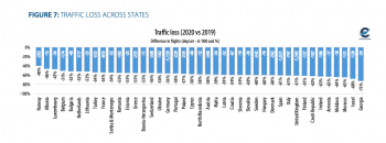 Για την Ελλάδα, σε σύνολο 41 χωρών, η χώρα μας κατατάσσεται στις αγορές με σχετικά χαμηλότερο ποσοστό μείωσης όσον αφορά τον αριθμό των πτήσεων την περασμένη χρονιά, κοντά στο 55%, με 255.000 λιγότερες πτήσεις το 2020 σε σύγκριση με το 2019. Συνολικά, οι πτήσεις στους ευρωπαϊκούς αιθέρες μειώθηκαν από 40% έως 73%, ανάλογα με τη χώρα.