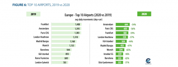 Ανά χώρα οι μεγαλύτερες αγορές στην Ευρώπη σημείωσαν πτώση, όπως προαναφέρθηκε, ως προς τον αριθμό των πτήσεων από 40% έως 73% και συγκεκριμένα: