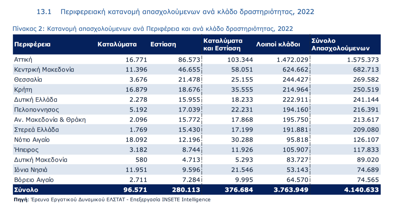 Ως προς την κατανομή ανά Περιφέρεια, οι Περιφέρειες της Αττικής (27,4%) και της Κεντρικής Μακεδονίας (15,4%) καταγράφουν τα υψηλότερα μερίδια απασχολούμενων στα καταλύματα και την εστίαση για το 2022 και ακολουθούν οι τουριστικές Περιφέρειες της Κρήτης (9,4%) και του Νοτίου Αιγαίου (8%). Οι Περιφέρειες Ιονίων Νήσων (28,8%), Νοτίου Αιγαίου (24,0%), Κρήτης (14,2%), Βορείου Αιγαίου (13,4%), Πελοποννήσου (10,3%) και Ηπείρου (10,1%) εμφάνισαν τα υψηλότερα ποσοστά απασχόλησης στα Καταλύματα και την Εστίαση ως προς το σύνολο της απασχόλησης της αντίστοιχης Περιφέρειας.