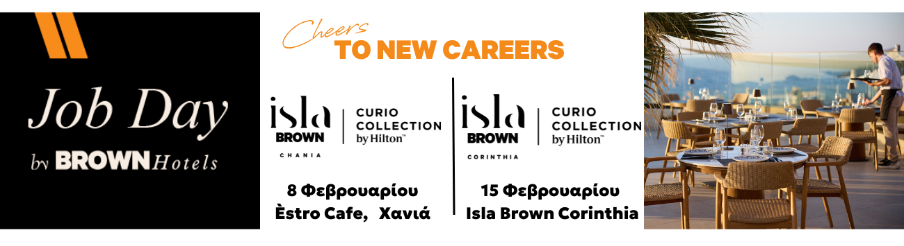 Η Ημέρα Καριέρας του Isla Brown Chania Resort, Curio Collection by Hilton θα πραγματοποιηθεί από τις 10:00 το πρωί έως τις 18:00 στο Estro Chania, ενώ του Isla Brown Corinthia, Curio Collection by Hilton από τις 10:00 το πρωί έως τις 18:00 στον πολυχώρο εκδηλώσεων του ξενοδοχείου. Στελέχη των Brown Hotels και μέλη της ομάδας των resorts θα είναι διαθέσιμα για να συζητήσουν με τους ενδιαφερόμενους σχετικά με τις διαθέσιμες θέσεις εργασίας, τις ευκαιρίες επαγγελματικής ανάπτυξης που προσφέρονται στα ξενοδοχεία της αλυσίδας, καθώς και για να τους παρουσιάσουν τη μοναδική φιλοσοφία φιλοξενίας και δημιουργικότητας που χαρακτηρίζει τα Brown Hotels.