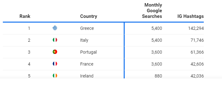 Τα αποτελέσματα προέκυψαν μετά από μηνιαίες μετρήσεις των μέσων διαδικτυακών αναζητήσεων για τις παραλίες όλων των Ευρωπαϊκών χωρών, σε διάστημα 12 μηνών. Σύμφωνα με την έρευνα, η Ελλάδα είναι με διαφορά η νικήτρια με 5.400 μηνιαίες διαδικτυακές αναζητήσεις και 142.000 instagram hashtags.