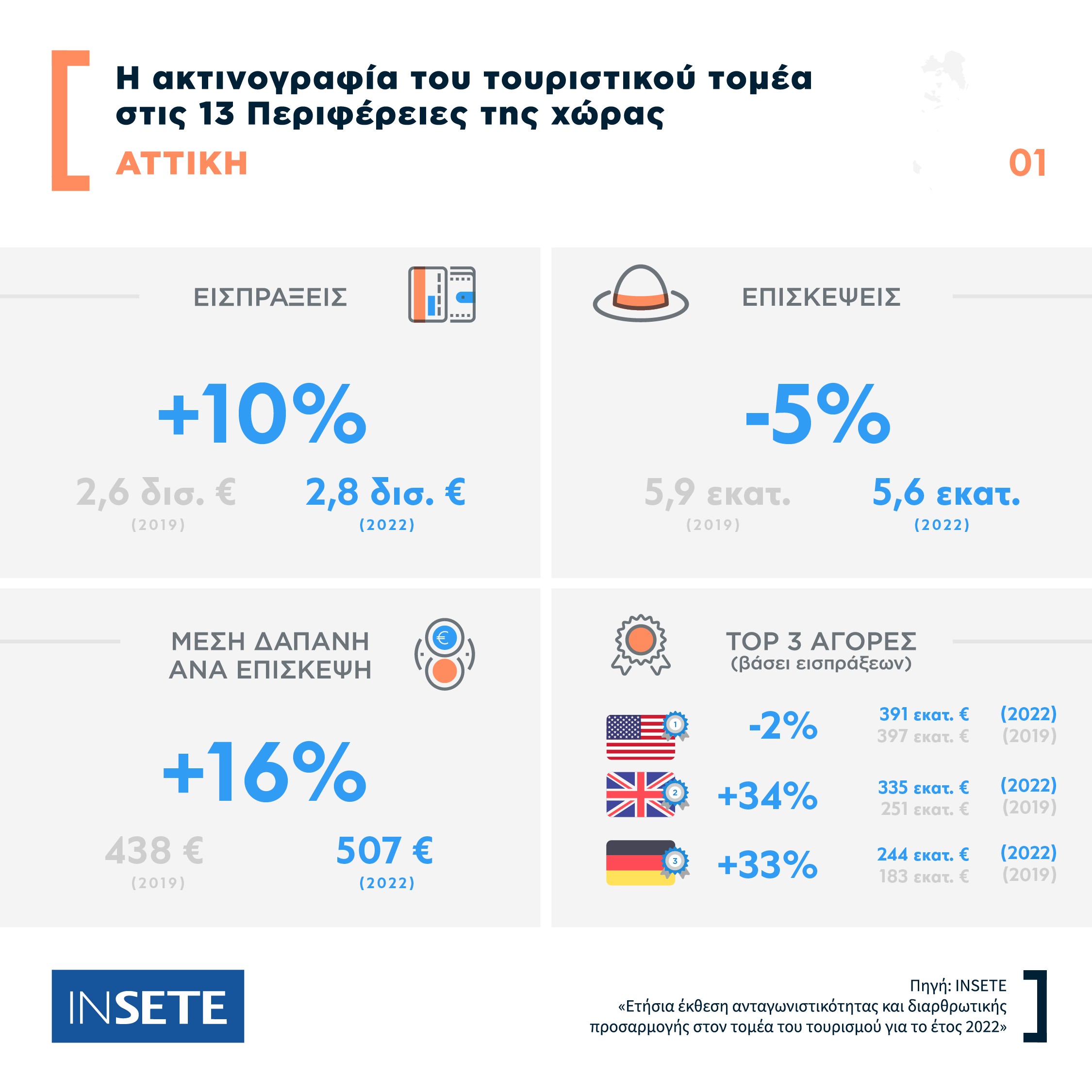 Η Περιφέρεια Αττικής υποδέχθηκε το 18% των επισκέψεων που καταγράφηκαν στις Περιφέρειες της Ελλάδας το 2022, σημειώνοντας μείωση κατά 5% σε σύγκριση με το 2019 (από 5,9 εκατ. σε 5,6 εκατ.). Η Αττική κατέχει μερίδιο 17% στο σύνολο των τουριστικών εισπράξεων που σημειώθηκαν στη χώρα το 2022, παρουσιάζοντας αύξηση κατά 10% σε σύγκριση με το 2019 (από 2,6 δισ. ευρώ σε 2,8 δισ. ευρώ). Η Μέση Δαπάνη αυξήθηκε κατά 16% από 438 ευρώ σε 507 ευρώ.