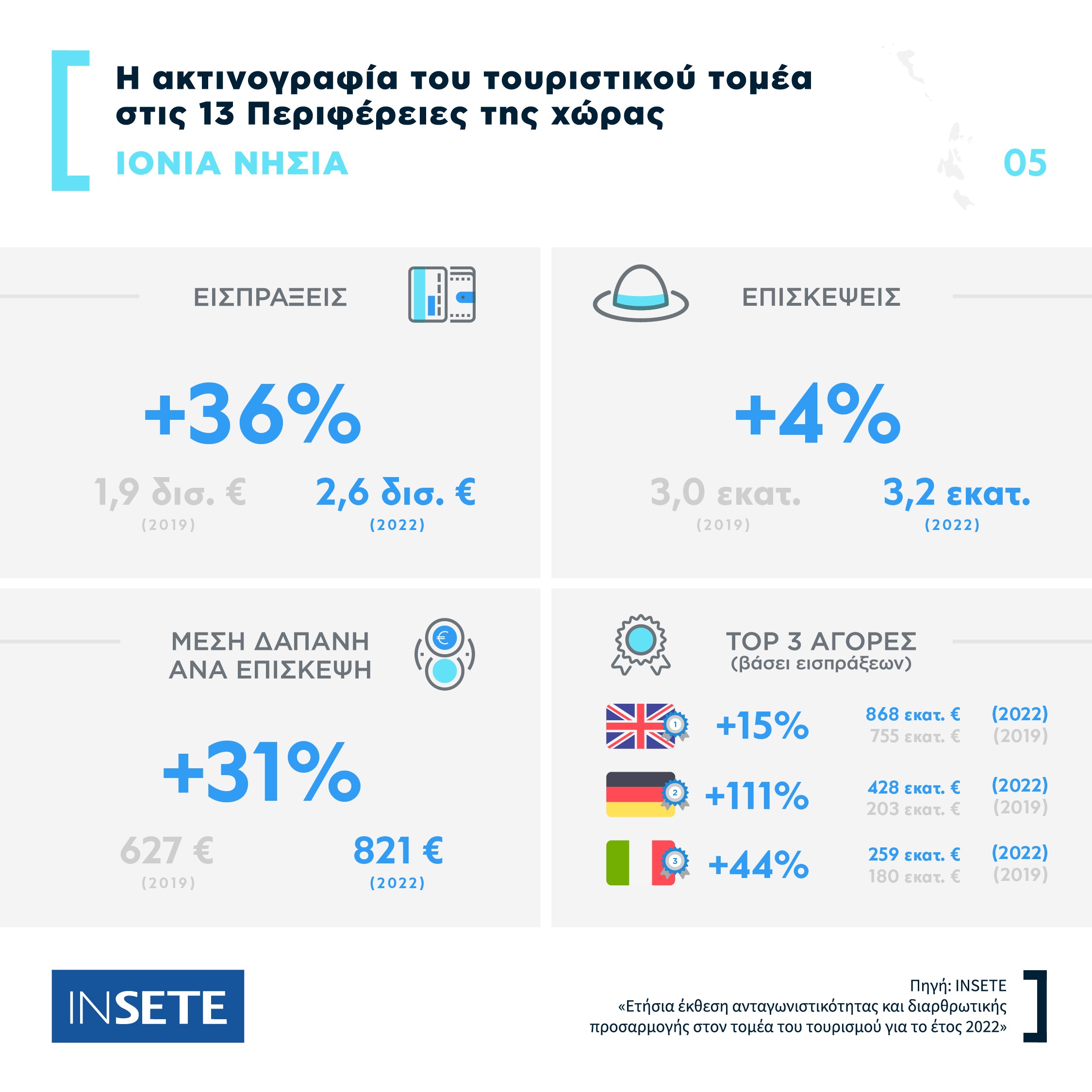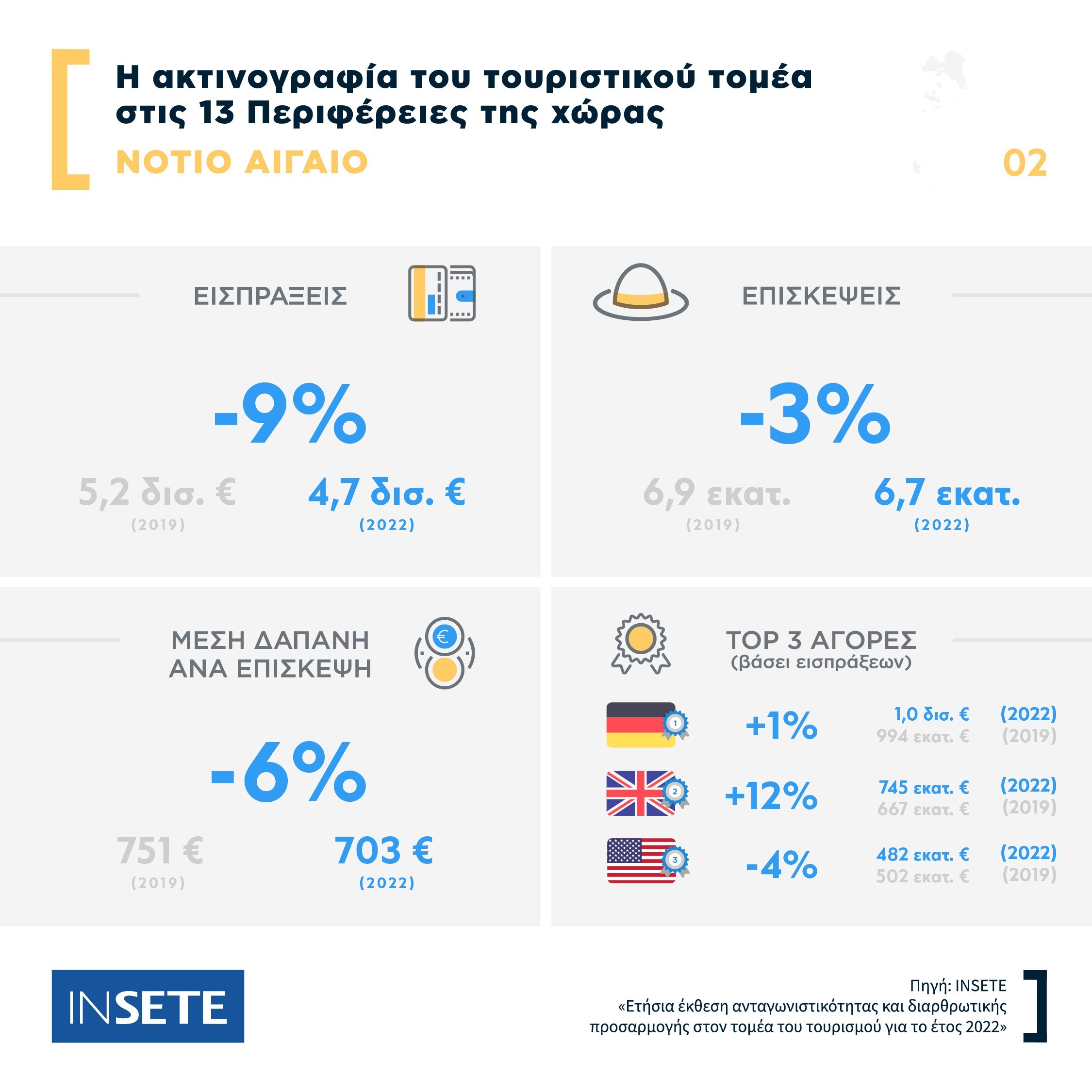 Ειδικότερα, με βάση τις εκθέσεις του ΙΝΣΕΤΕ, η Περιφέρεια Νοτίου Αιγαίου υποδέχθηκε το 21% επί του συνόλου των επισκέψεων το 2022, με μείωση κατά 3% σε σύγκριση με το 2019 (από 6,9 εκατ. σε 6,7 εκατ.). Το Νότιο Αιγαίο κατέχει από την άλλη πλευρά, το υψηλότερο μερίδιο, της τάξεως του 27% επί του συνόλου των τουριστικών εισπράξεων της χώρας, έστω κι αν αυτό εμφανίζεται μειωμένο κατά 9% σε σύγκριση με το 2019 (από 5,2 δισ. ευρώ σε 4,7 δισ. ευρώ). Η Μέση Δαπάνη μειώθηκε επίσης κατά 6% από 751 ευρώ σε 703 ευρώ.