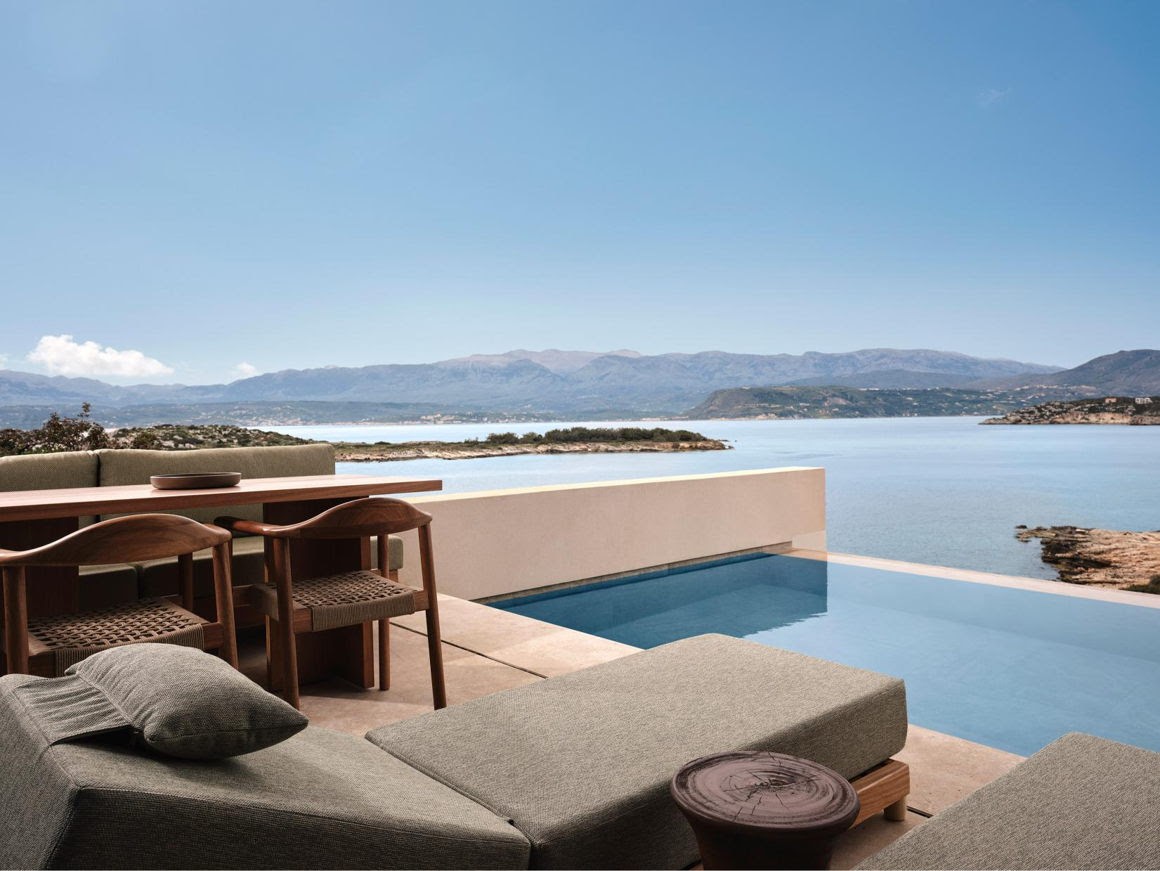 Οι ευρύχωρες βεράντες και οι ιδιωτικές πισίνες κάθε δωματίου ενισχύουν τη σύνδεση με τη θάλασσα και τον ουρανό, ενώ οι εσωτερικοί χώροι χαρακτηρίζονται από γήινες αποχρώσεις της Μεσογείου: τερακότα, ελιά, άμμος και πέτρα. Οι χειροποίητες κεραμικές λεπτομέρειες και ο φωτισμός τιμούν την κρητική παράδοση μέσα από μια σύγχρονη ματιά.