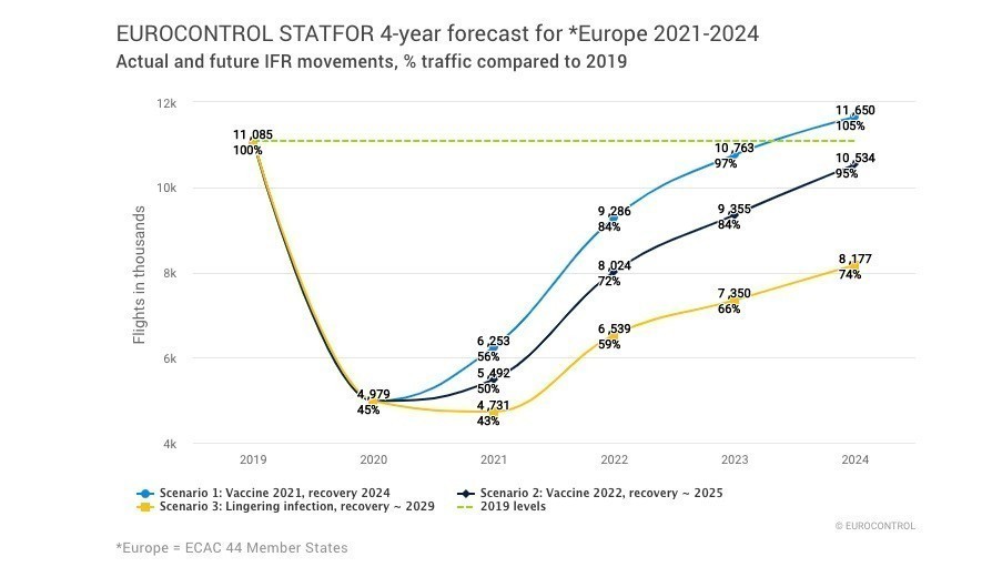 Το Eurocontrol έχει επεξεργαστεί τρία διαφορετικά σενάρια, το πιο αισιόδοξο, το ενδιάμεσο και το πιο απαισιόδοξο. Αναλυτικότερα: