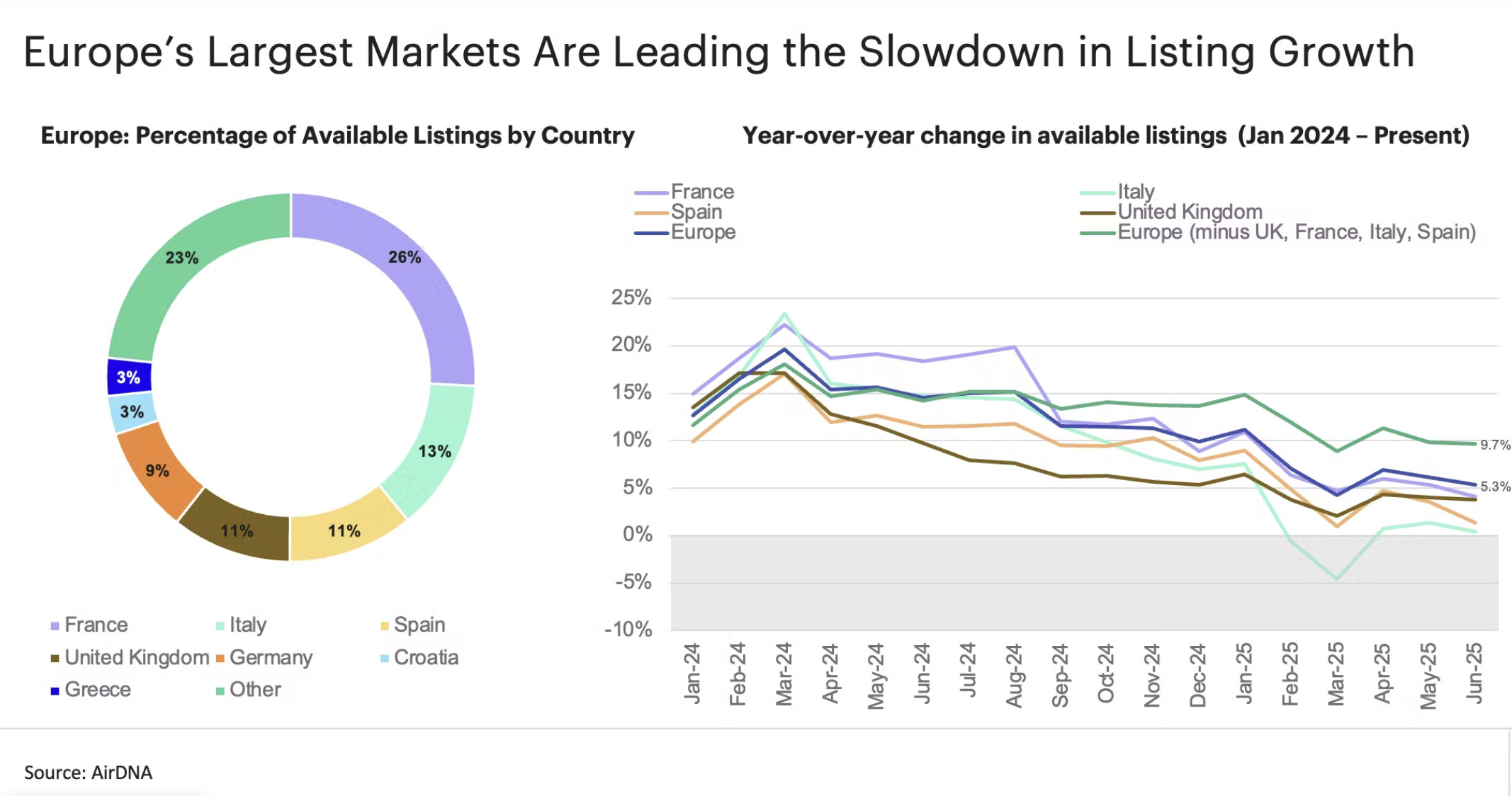 Η γνωστή εταιρεία αναλύσεων δεδομένων για τις βραχυχρόνιες μισθώσεις κάνει ειδική αναφορά και στο θέμα της δημοσιότητας που έχει πάρει το ζήτημα του υπερτουρισμού σε όλη την Ευρώπη, γεγονός το οποίο, όπως επισημαίνει, έχει οδηγήσει και σε αυστηροποίηση των κανόνων της αγοράς σε αρκετές ευρωπαϊκές χώρες. «Η μείωση των καταχωρήσεων σε γνωστούς προορισμούς κορυφαίων αγορών όπως η Ιταλία, η Γαλλία και η Ισπανία οφείλονται εν μέρει και σε αυτούς τους αυστηρότερους κανόνες», αναφέρεται σχετικά. Επικαλούμενη στοιχεία της Oxford Economics η AirDNA κάνει λόγο για τριπλάσια κάλυψη των μέσων ενημέρωσης σε θέματα υπερ-τουρισμού σε όλη την Ευρώπη σε σχέση με πέρυσι, συμπεριλαμβανομένης και της χώρας μας.