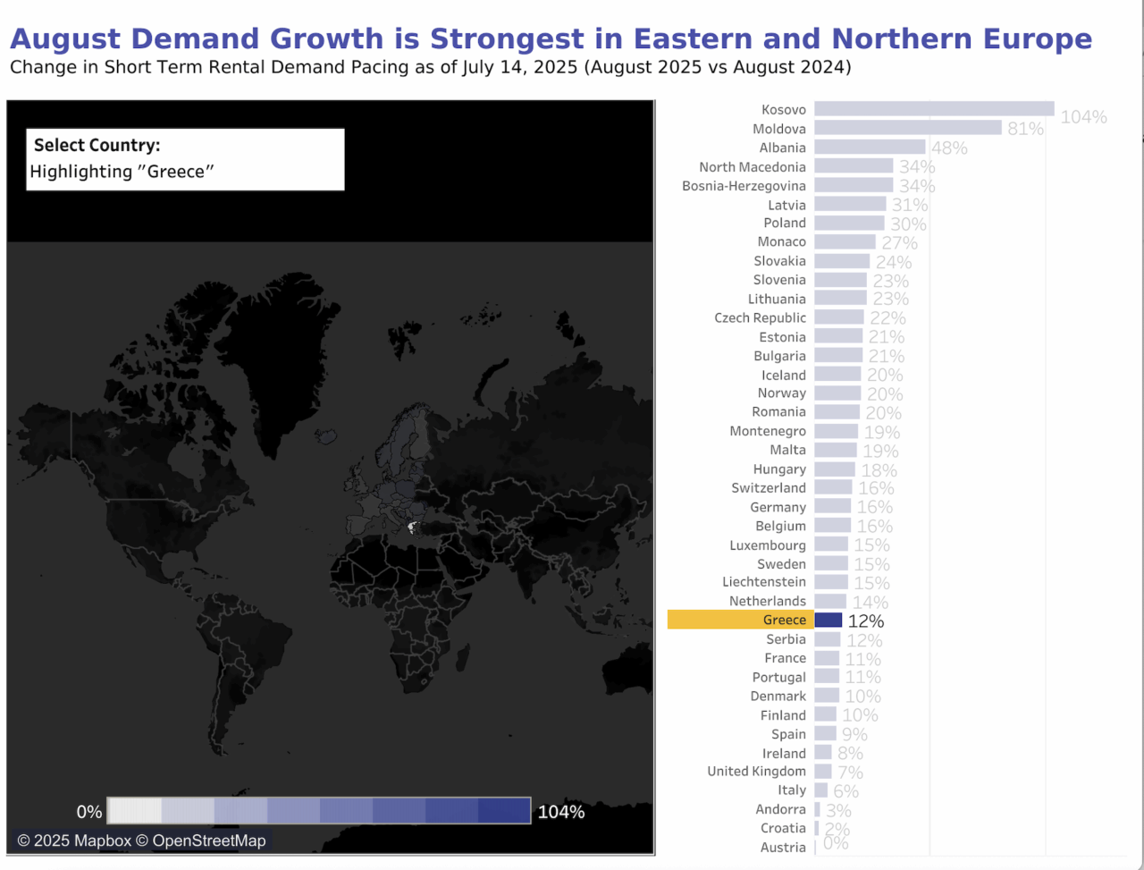 Άλλες ευρωπαϊκές αγορές, συμπεριλαμβανομένων της Πολωνίας, της Βοσνίας Ερζεγοβίνης και της Βόρειας Μακεδονίας έχουν αύξηση στις κρατήσεις σε ποσοστό πάνω από 30% σε ετήσια βάση. Αντίστοιχα και η Bόρεια Ευρώπη προσελκύει περισσότερους επισκέπτες: Εσθονία, Λιθουανία και Νορβηγία έχουν άνοδο κρατήσεων για τον Αύγουστο μεταξύ 20% -30%. Στον αντίποδα, οι νότιες ευρωπαϊκές αγορές, όπως η Ιταλία και η Ισπανία έχουν ανάπτυξη της τάξεως του 10% ή ακόμα πιο κάτω. Η Ελλάδα βρίσκεται ελάχιστα υψηλότερα, στο συν 12%, για το μήνα Αύγουστο σε σχέση με πέρυσι.