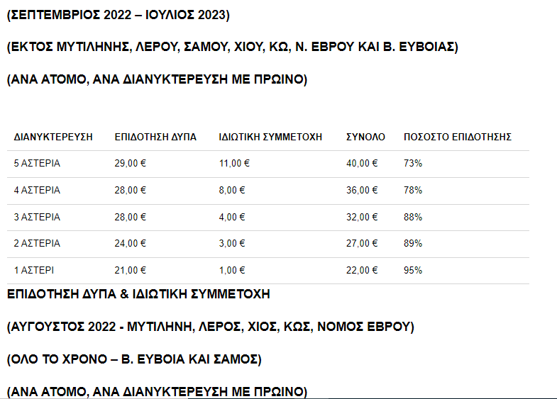Οι φετινές αυξημένες τιμές επιδότησης αφορούν σε όλες τις κατηγορίες καταλυμάτων (5-12% σε ξενοδοχεία και 3-8% σε ενοικιαζόμενα δωμάτια), ώστε να καλυφθεί το αυξημένο κόστος και να εξασφαλιστεί μεγάλη συμμετοχή. Επιπλέον, για το μήνα αιχμής Αύγουστο προβλέπεται αύξηση της επιδότησης κατά 20%, όπως και πέρυσι ώστε να υπάρξει μεγαλύτερη συμμετοχή των τουριστικών επιχειρήσεων τη συγκεκριμένη περίοδο. Η αύξηση θα ισχύει για όλο το χρόνο για τα καταλύματα της Βόρειας Εύβοιας και της Σάμου.