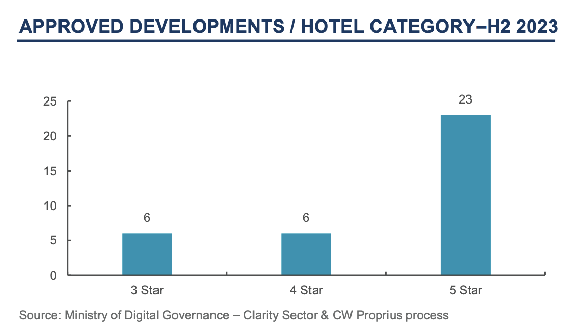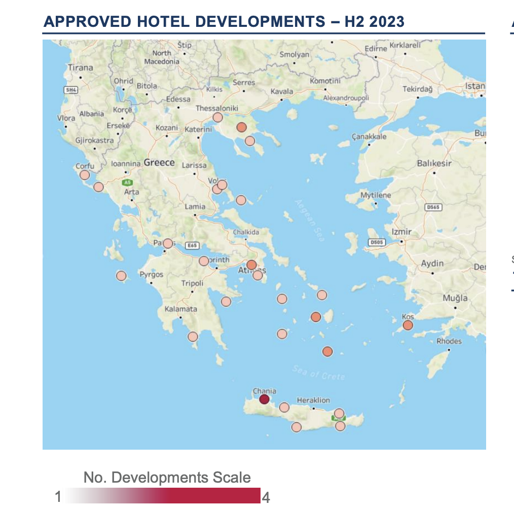 Από τα στοιχεία που επικαλείται η γνωστή εταιρεία συμβούλων ακινήτων Cushman Wakefield Proprius (CW Proprius) στην τελευταία της μελέτη για τον ελληνικό τουρισμό με περίοδο ανάλυσης στο β΄εξάμηνο 2023 προκύπτει επίσης ότι η συντριπτική πλειονότητα των εγκεκριμένων αναπτύξεων αφορά την κατηγορία των 5 αστέρων -23 συνολικά- και ακολουθούν επίσης οι κατηγορίες των 3 και 4 αστέρων με 6 αναπτύξεις έκαστη. «Συνολικά, κι ενώ η Ελλάδα συνεχίζει να τοποθετείται στην αγορά ως κορυφαία επιλογή στον τομέα της πολυτελούς φιλοξενίας και των εμπειριών, οι προοπτικές για τον τουριστικό κλάδο φαίνονται πολλά υποσχόμενες, με ευκαιρίες για περαιτέρω επέκταση και ανάπτυξη στον ορίζοντα, δεδομένου ότι διαφαίνεται και η άμβλυνση της εποχικότητας του τουρισμού», αναφέρει στην ανάλυσή της η CW Proprius.