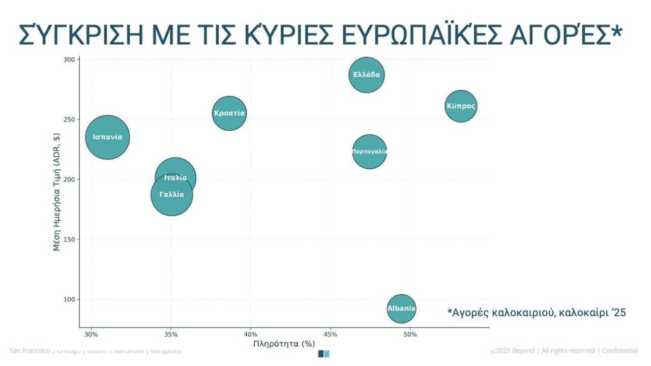 Η ίδια, αξιοποιώντας τα δεδομένα της περυσινής χρονιάς έκανε και τη σύγκριση της Ελλάδας με τις κύριες ευρωπαϊκές αγορές, Ισπανία, Κροατία, Κύπρο, Ιταλία, Γαλλία, Πορτογαλία αλλά και την ανερχόμενη Αλβανία. Η χώρα μας, το 2025 είχε πολύ ικανοποιητικά νούμερα με ψηλότερα από όλες τις υπόλοιπες αγορές τη μέση ημερήσια τιμή στα πέριξ των 300 ευρώ, «λόγω των νησιών», όπως χαρακτηριστικά αναφέρθηκε «με πολύ θετικές πληρότητες». Σε επίπεδο προσφοράς, οι καταχωρήσεις ήταν αυξημένες σε όλες τις αγορές, με τα νούμερα της Ελλάδας να παραπέμπουν σε ένα +18%, ενώ εντυπωσιακή είναι η αύξηση στην Αλβανία με ένα +68% σε επίπεδο προσφοράς αλλά… αρνητική απόδοση λόγω χαμηλής ποιότητας των καταλυμάτων. Η αντίστοιχη απόδοση στην Ελλάδα διαμορφώνεται στο +13%, ψηλότερα από Κύπρο (+12%), Πορτογαλία (+4%) και Ιταλία (+1%), αλλά χαμηλότερα από την Κροατία (+35%).