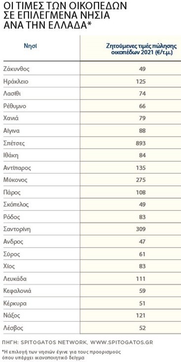 Εκτός συναγωνισμού είναι οι Σπέτσες, όπου λόγω υψηλού συντελεστή δόμησης (ακόμη και στο 0,8 στα εντός σχεδίου οικόπεδα) η μέση ζητούμενη τιμή εμφανίζεται στις αγγελίες ως η υψηλότερη, αγγίζοντας τα 900 ευρώ ανά τ.μ.