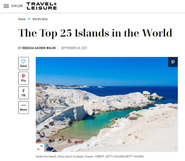 Ως το καλύτερο νησί στον κόσμο και την Ευρώπη για το 2021 (Top Island in the World / Top Island in Europe), με τη σχεδόν άριστη βαθμολογία 95.50, αναδείχθηκε η Μήλος από τους πολυάριθμους αναγνώστες του κορυφαίου αμερικανικού ταξιδιωτικού περιοδικού «Travel + Leisure», που συμμετείχαν στην ψηφοφορία για τα World’s Best Awards 2021.