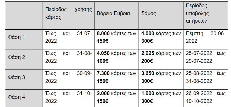 Η δεύτερη φάση του προγράμματος αφορά σε άυλες ψηφιακές χρεωστικές κάρτες τις οποίες οι δικαιούχοι θα μπορούν να χρησιμοποιήσουν για το διάστημα έως και 31-08-2022 για δαπάνες διαμονής, εστίασης και τοπικών μεταφορών στις παραπάνω πληγείσες περιοχές. Ειδικότερα, για τη Βόρεια Εύβοια πρόκειται να εκδοθούν 4.050 κάρτες των 100€ και για τη Σάμο 2.025 κάρτες των 200€. Η πλατφόρμα vouchers.gov.gr θα παραμείνει ανοιχτή για τη δεύτερη φάση του προγράμματος από τις 12:00 της 25ης Ιουλίου και μέχρι να εξαντληθούν οι άυλες ψηφιακές χρεωστικές κάρτες, με καταληκτική ημερομηνία υποβολής αιτήσεων την 29η Ιουλίου.
