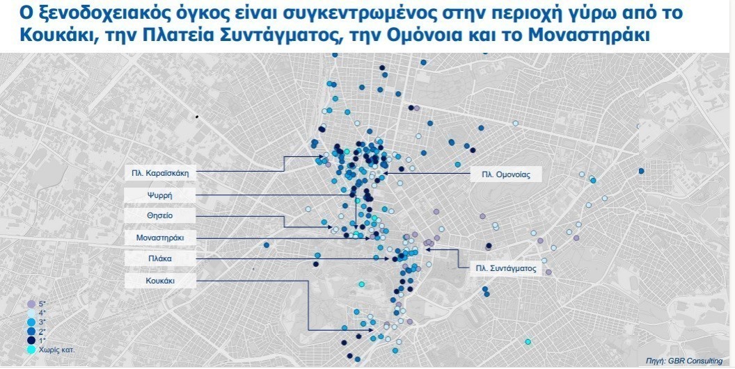 Με βάση την επεξεργασία από την GBR Consulting, ο ξενοδοχειακός όγκος είναι συγκεντρωμένος στην περιοχή γύρω από το Κουκάκι, την πλατεία Συντάγματος, την Ομόνοια και το Μοναστηράκι, επιβεβαιώνοντας και τις εκτιμήσεις για μονάδες δύο ταχυτήτων στην πόλη και δημιουργώντας, όπως είναι εύλογο, και σημαντικές πιέσεις στους κατοίκους. Πολύ περισσότερο δε αν ληφθεί υπόψη και το γεγονός ότι ειδικά την περίοδο 2015- 2019 οι μονάδες βραχυχρόνιας μίσθωσης αυξήθηκαν κατά 60%- σύμφωνα πάντα με την επεξεργασία των στοιχείων από την GBR Consulting- με μείωση των εν λειτουργία μονάδων μέσα στην πανδημία και εκ νέου αύξηση το 2022.
