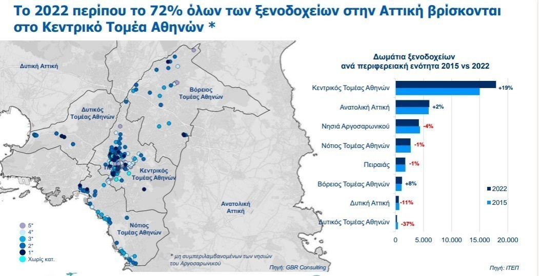 Τα συμπεράσματα αυτά προκύπτουν από την επεξεργασία των στοιχείων του Ινστιτούτου Τουριστικών Ερευνών και Προβλέψεων που έκανε η εξειδικευμένη εταιρεία συμβούλων GBR Consulting για λογαριασμό της Ενωσης Ξενοδόχων Αθηνών Αττικής Αργοσαρωνικού (ΕΞΑΑΑ) καταλήγοντας τελικά στο ότι το 72% όλων των ξενοδοχείων στην Αττική (μη συμπεριλαμβανομένων στην περίπτωση αυτή των νησιών του Αργοσαρωνικού) βρίσκονται στον Κεντρικό τομέα Αθηνών. Συνολικά στην Αττική, στο τέλος του 2022, με βάση τα στοιχεία από το Ξενοδοχειακό Επιμελητήριο Ελλάδος, ο αριθμός των ξενοδοχείων άγγιξε τα 700, για την ακρίβεια ανήλθε σε 698- με μία δυναμικότητα σχεδόν 34.600 δωματίων και 66.800 κλινών.