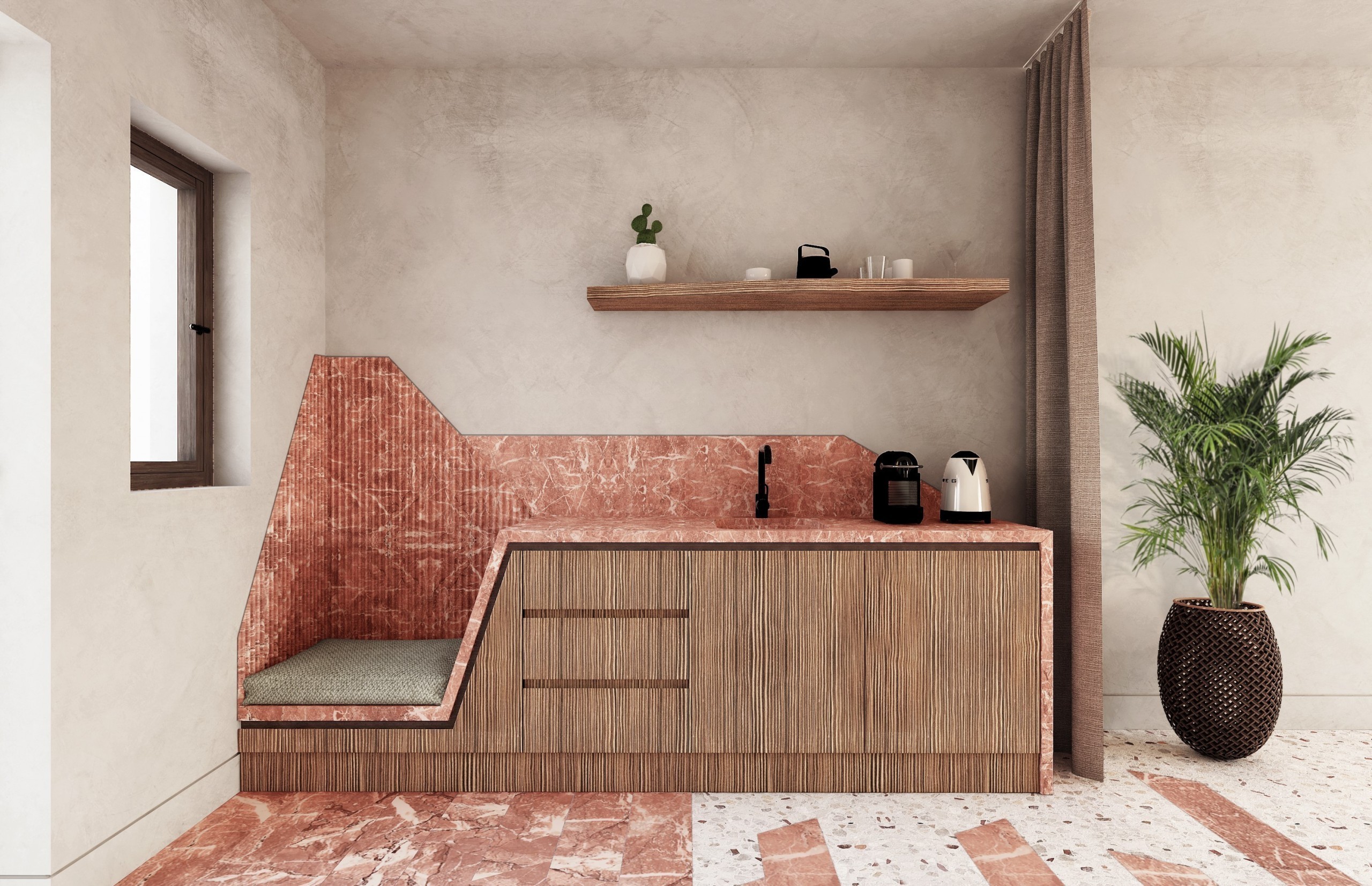 Τα υλικά, οι τεχνοτροπίες και οι υφές που έχουν χρησιμοποιηθεί σε όλους τους χώρους, ακολουθούν τα αντίστοιχα που υπάρχουν στη Σαντορίνη. Το NOŪS αντλεί έμπνευση από τις γεωμετρικές φόρμες της αρχιτεκτονικής του νησιού και τις επανερμηνεύει με σύγχρονους όρους».
