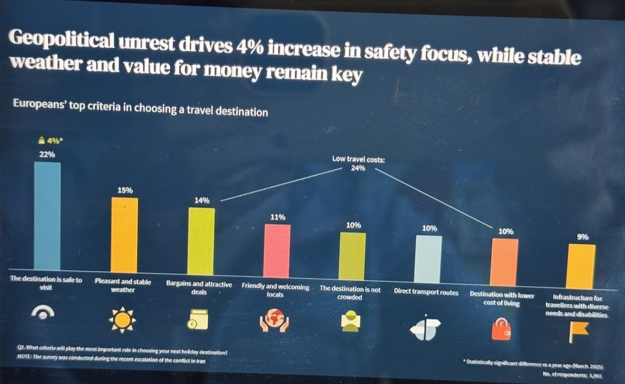 Το θέμα της ασφάλειας λόγω της γεωπολιτικής κατάστασης απασχολεί το ταξιδιωτικό κοινό και έχει ανέβει κατά 4 ποσοστιαίες μονάδες σε σύγκριση με την αντίστοιχη έρευνα του 2025 φτάνοντας πλέον το 22%. Οι ακραίες καιρικές συνθήκες και η κλιματική αλλαγή είναι επίσης ψηλά στις ανησυχίες, στο νούμερο 2, «ωστόσο αν προστεθούν οι παράμετροι των ευνοϊκών οικονομικών deals με 14% και του χαμηλού κόστους ζωής με 10% συγκεντρωτικά βλέπουμε ότι το θέμα του κόστους απασχολεί το κοινό αθροιστικά σε ποσοστό 24%».