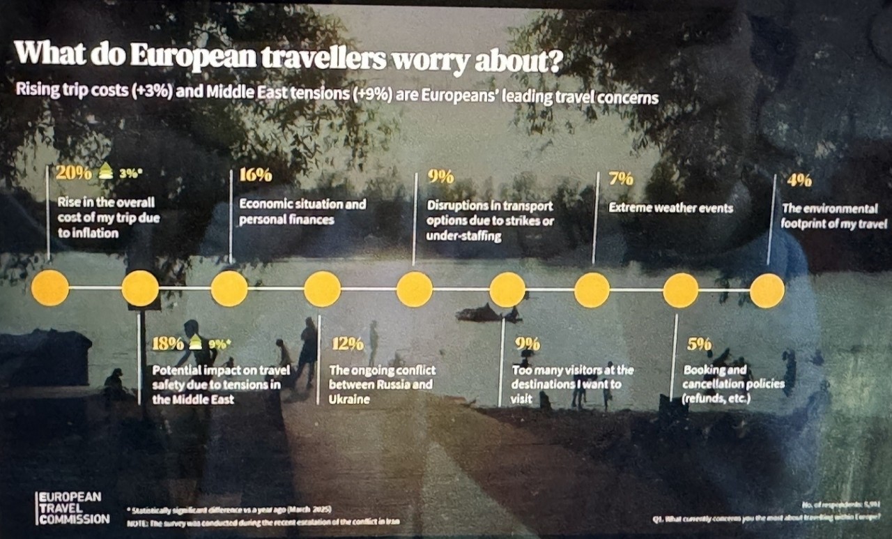 Στο ερώτημα γιατί ανησυχούν οι Ευρωπαίοι; Νούμερο 1 είναι η αύξηση του συνολικού κόστους λόγω του πληθωρισμού με 20% και ακολουθεί με 18% η απάντηση για πιθανό αντίκτυπο στην ασφάλεια των ταξιδιών λόγω του γεωπολιτικού παράγοντα, με αύξηση κατά 9 ποσοστιαίες μονάδες σε σύγκριση με την προηγούμενη έρευνα. «Οικονομικές και γεωπολιτικές πιέσεις λοιπόν είναι οι δύο βασικοί παράγοντες που ανησυχούν και διαμορφώνουν τις επιλογές για τους προορισμούς των Ευρωπαίων εφέτος το καλοκαίρι», σύμφωνα με τους αναλυτές. «Η ασφάλεια γίνεται προτεραιότητα και είναι σημαντικό για τους προορισμούς να καθιερώσουν διαδικασίες που να προβάλλουν ειδικά ότι είναι ασφαλής, παρέχοντας παράλληλα και ενημέρωση μέσα από επίσημα κανάλια. Το θέμα της υπεύθυνης ενημέρωσης είναι σημαντικό, γιατί όπως έχει αποδειχθεί στην πράξη οι ταξιδιώτες προτιμούν να γνωρίζουν από τους επίσημους φορείς όταν πρόκειται για θέμα ασφάλειας. Γι’ αυτό και είναι σημαντικές και οι στοχευμένες καμπάνιες για το λεγόμενο ‘’business as usual’’», όπως επισημάνθηκε χθες.