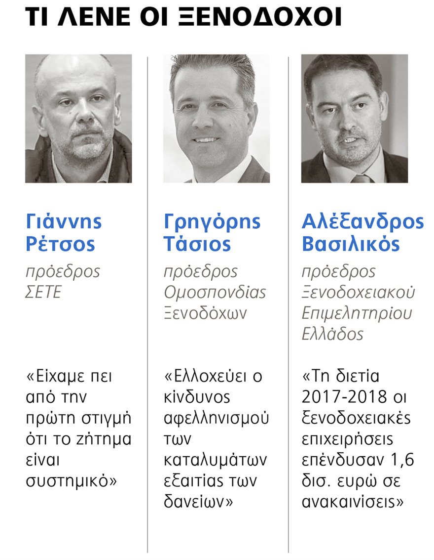 Την ίδια στιγμή, συναγερμός έχει σημάνει και στις τράπεζες για τα δάνεια των ξενοδόχων. Οπως αναφέρουν οι πληροφορίες, πρόκειται για έναν από τους μεγάλους πονοκεφάλους που έχει να αντιμετωπίσει το οικονομικό επιτελείο, εν μέσω της εντεινόμενης πίεσης από πλευράς του ξενοδοχειακού κλάδου για άμεσα μέτρα -από χθες-, όπως τονίζουν χαρακτηριστικά οι φορείς μέσα από τα επίσημα όργανά τους, τον ΣΕΤΕ, το Ξενοδοχειακό Επιμελητήριο και την Πανελλήνια Ομοσπονδία Ξενοδόχων.
