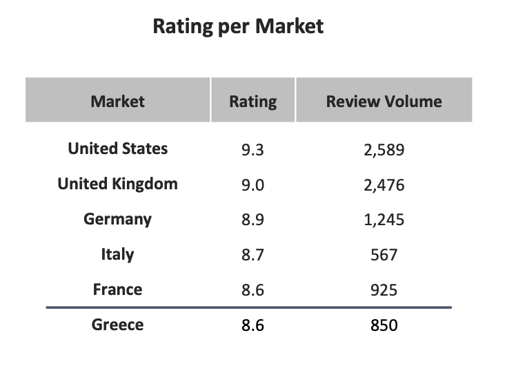Υψηλότερη από τον ευρωπαϊκό μέσο όρο είναι η αξιολόγηση της Ελλάδας ως τουριστικού προορισμού με τους ταξιδιώτες από τις ΗΠΑ και το Ηνωμένο Βασίλειο να αποδίδουν στη χώρα μας τις υψηλότερες συνολικές αξιολογήσεις, ενώ ακολουθούν οι Γερμανοί, οι Ιταλοί και οι Γάλλοι επισκέπτες που συνθέτουν το τοπ 5 των εθνικοτήτων.