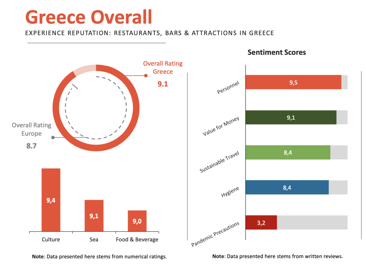 Τα στοιχεία προέρχονται από την τελευταία ανάλυση για τη «Συνολική φήμη της Ελλάδας και της Αθήνας την περίοδο Οκτωβρίου- Δεκεμβρίου 2023» από το Ινστιτούτου του Συνδέσμου Ελληνικών Τουριστικών Επιχειρήσεων (ΙΝΣΕΤΕ). Το ΙΝΣΕΤΕ στο πλαίσιο παρακολούθησης της τουριστικής δραστηριότητας μέσα από διαφοροποιημένες πηγές, συνεργάζεται με την εταιρεία TCI Research (που πλέον αποτελεί τμήμα της εταιρείας MMGY) σχετικά με τη συλλογή big data για την Ελλάδα και ανταγωνιστικούς προορισμούς (Ιταλία, Ισπανία, Πορτογαλία, Κροατία) επιτρέποντας τη σύγκριση της συνολικής εικόνας της χώρας και της Αθήνας με τον ανταγωνισμό. Στα πλαίσια της ανάλυσης έχουν αξιολογηθεί 94 χιλ. σχόλια για αξιοθέατα (attractions) και 52 χιλ. για εστιατόρια / bar στην Ελλάδα και 4,8 εκατ. και 8,8 εκατ. αντίστοιχα για ανταγωνιστικούς προορισμούς.